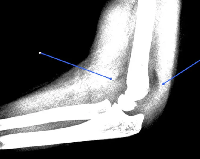 Skadekonf: Der ses udisloceret fraktur af tub majus ve prox humerus samt udisloceret avulsionsfraktur af spids af laterale malleol hø.