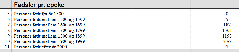 Spørger jeg Legacy, hvornår personerne i min database er født, fortæller programmet, at jeg har fem personer født i 1500-tallet og 187 personer født i 1600-tallet. Det skal nok passe.