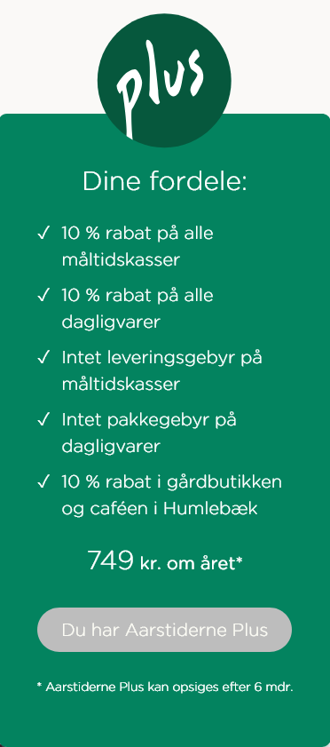 Der er selvfølgelig noget, der hedder økonomi, så jeg har tegnet et Aarstiderne Plus-medlemskab. Det koster 749 kr. om året. For det beløb får jeg 10 pct. på alle mine køb, og jeg sparer leveringsgebyret og pakkegebyret på hver levering. I 2025 sparede jeg 5.000 kr., og det er så netto 4.200 kr., der jo da også er en slags penge.