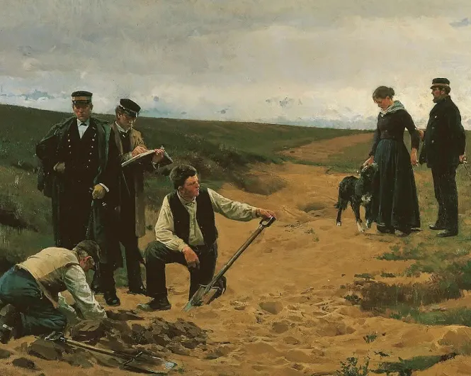 Som Lex.dk skriver, forstår man af sammenhængen, at det, mændene i forgrunden graver efter, er et barnelig, som hun har gravet ned. Mændene, der graver, overvåges af øvrigheden, så intet kan forblive fordækt.