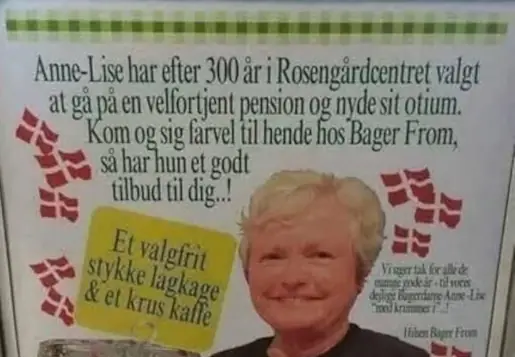 11) En Facebookbruger faldt den 13/1 over den stærkt stigende pensionsalder: “Anne-Lise har efter 300 år i Rosengårdscentret valgt at gå på velfortjent pension og nyde sit otium”. Det er hende vel undt.