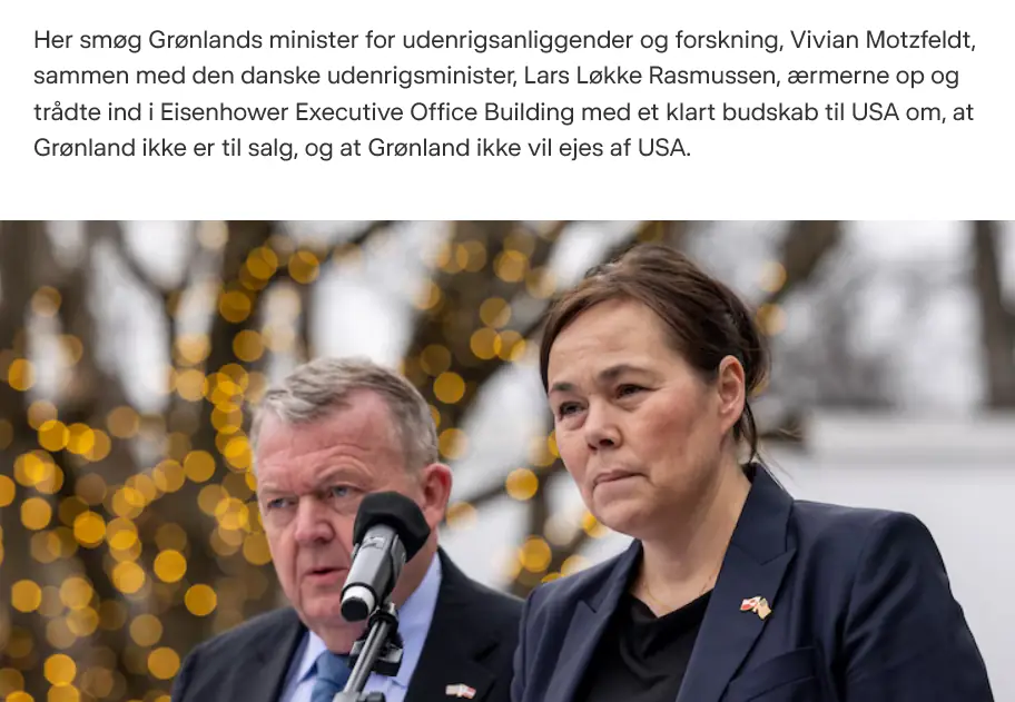 15) TV2’s nyheder den 18/1. Tilsendt af Charlotte. Tak for det. USA og Danmark/Grønland er i konflikt, og det mærker herboende amerikanere, der nu er flove over deres hjemland: “Skjuler om sin nationalitet: – Jeg kan ikke holde til den negative respons”.