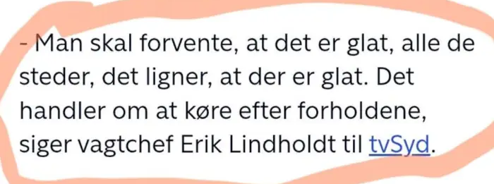 6) Snevejret blev ikke helt så slemt som varslet, men jeg får det aldrig godt med udtrykket “det ligner at”. tvSyd skrev den 13/2: “Man skal forvente, at det er glat, alle de steder, det ligner, at der er glat”.