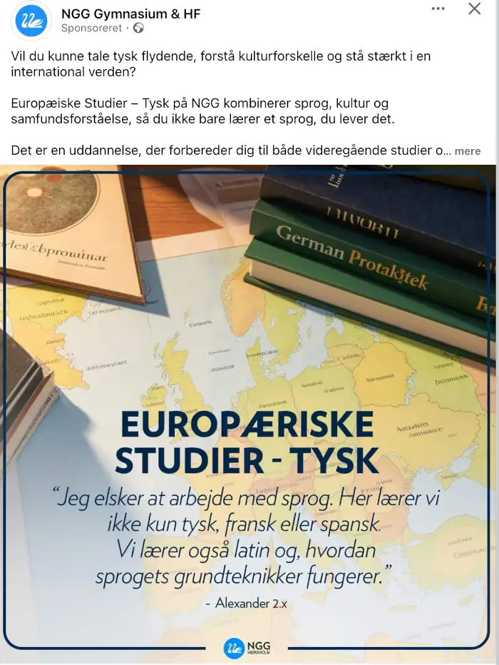 4) Dette er formentlig en reklame for NGG Gymnasium & HF, der ser ud til at stå for “Nordsjællands Grundskole og gymnasium” og derfor placerer jeg også denne i kategorien Professionelle: “Europæriske studier – Tysk”.
