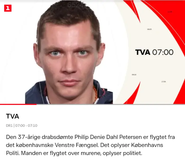 1) TV Avisen den 4/2. Det lykkedes Philip at flygte over murene fra Venstre Fængsel: “Den 37-årige drabsdømte Philip Denie Dahl Petersen er flygtet fra det københavnske Venstre Fængsel”.