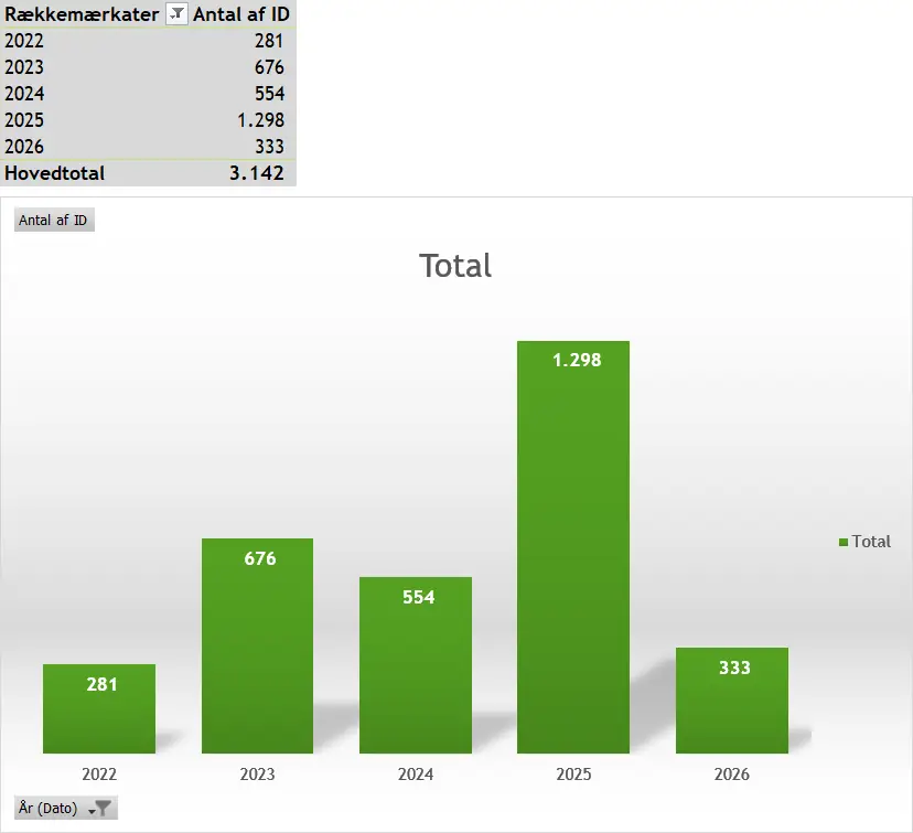 Lige nu er status vist på grafen herunder – fordelt på år:
